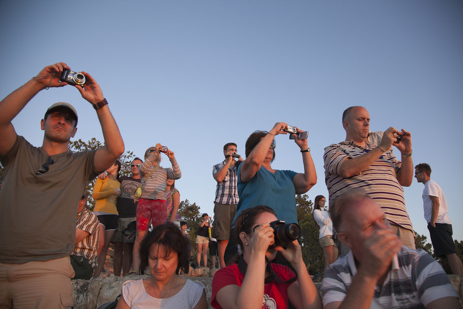 We stayed at the Canyon til Sunset and watched the rocks turn a beautiful shade of red. It's funny, when we got to the Canyon there weren't nearly as many people there as at Sunset. Everyone had their prime spot picked out for optimum photo taking. I turned around to look at the crowd and grabbed a quick, funny shot of everyone with their cameras out.
